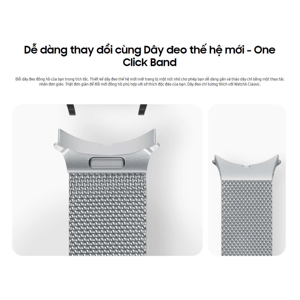 Đổi dây đeo đồng hồ của bạn trong tích tắc. Thiết kế dây đeo thế hệ mới mới trang bị một nút nhỏ cho phép bạn dễ dàng gắn và tháo dây chỉ bằng một thao tác nhấn đơn giản. Thật đơn giản để đổi mới đồng hồ phù hợp với sở thích độc đáo của bạn. Dây đeo chỉ tương thích với Watch 4 5 6 7 FE bản 40mm.